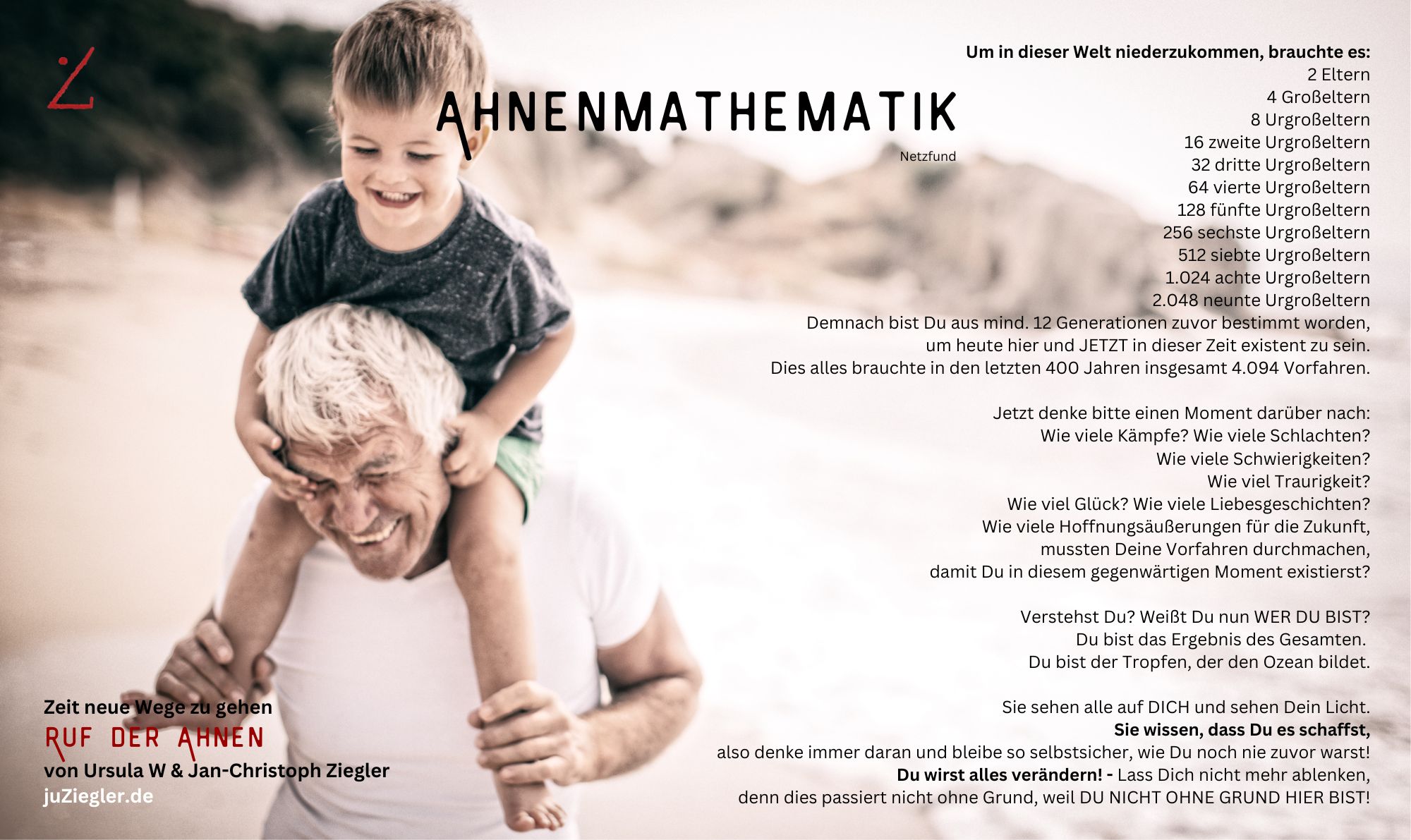 Ob wir wollen oder nicht, wir sind mit unseren Ahnen über viele Generationen verbunden. Somit tragen wir – unbewusst – auch die Themen, wie Schwere, Blockaden, Leichtigkeit und Spiritualität sowie die Talente unserer Ahnen in uns. Ohne dass es auf den ersten Blick gesehen werden kann, sind wir mit denen, die vor uns waren, stark verknüpft. In der Epigenetik, ein Zweig der Biologie, wird genau diese tiefgehende Prägung mit ihren Auswirkungen erforscht und bestätigt.